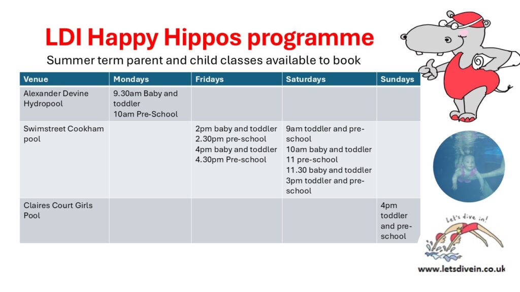 Let’s Dive In is an accredited swimming school based in Maidenhead, Taplow, Burnham and Slough, providing swimming lessons and aquatic opportunities to people of all ages and abilities